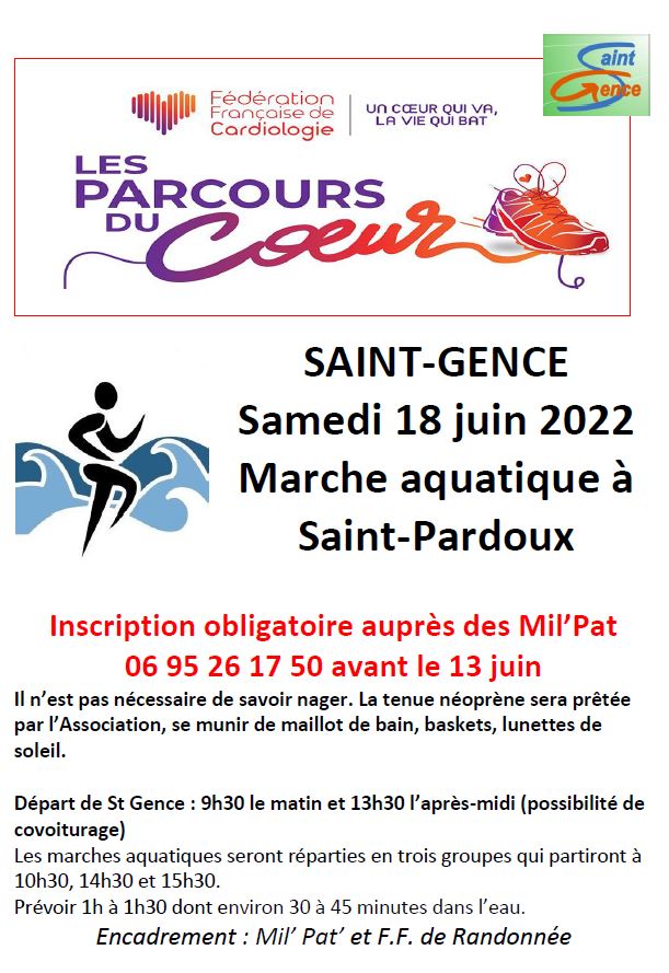 Le 11 juin : randonnée pédestre de 5,5 km - départ 14h30 Gymnase le Lemovix Le 18 juin : marche aquatique au lac de St Pardoux (plage Santrop)/Inscription obligatoire PARTICIPATIONS GRATUITES
