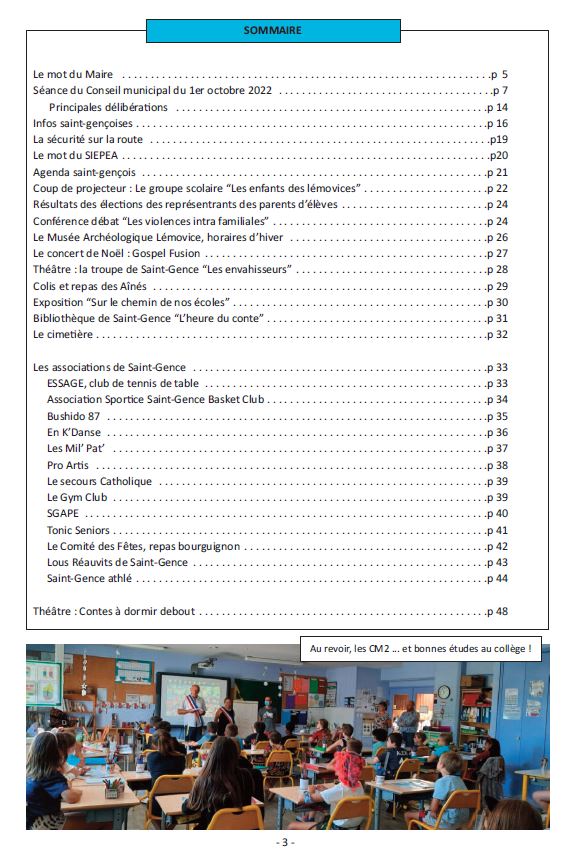 Actualité Quel succès ! Les canards n'arrivent pas par la poste Publié le 16/11/2025 Récompenses des lauréats du concours des Maisons Fleuries Publié le 15/11/2025 Bordeaux-Lyon : une ligne SNCF mythique ! Publié le 14/11/2025 Le Bulletin municipal de Saint-Gence octobre 2022 téléchargement ici (pdf 12 Mo) publié le 26/10/2022 http://saint-gence.fr/actualite/index.php?id=329 1369 Publier Partager Chargement...