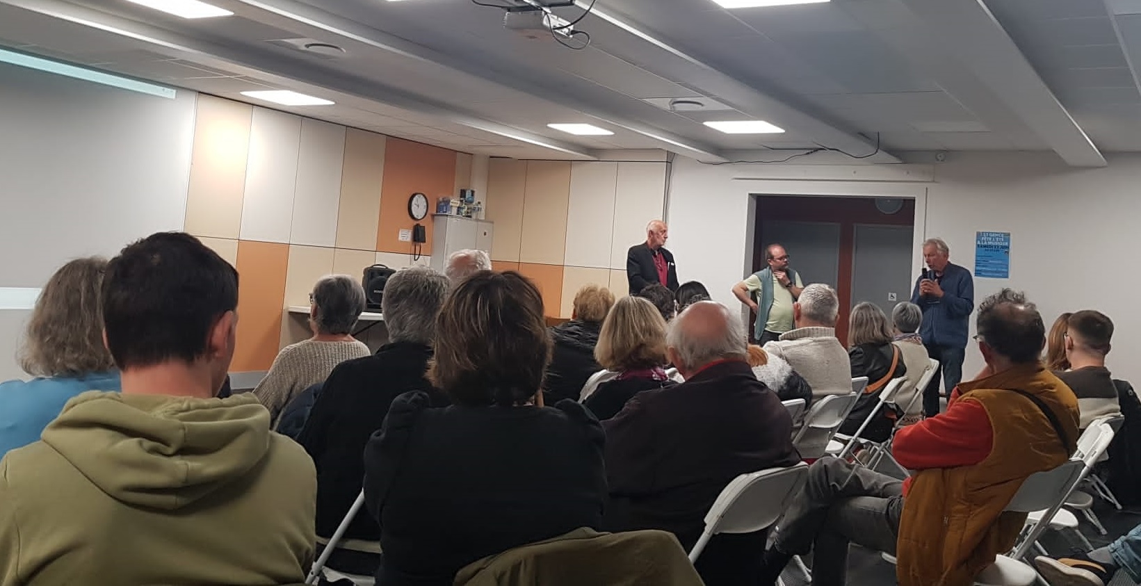 La projection a été suivie d'une séance de questions/réponses animée par David Geoffroy et par Jean-Claude Chastanet, amateur et passionné de la vie des Néandertaliens qui ont peuplé l'Europe et une partie de l'Asie pendant 350 000 ans avant de disparaître vers -40 000 ans peu après l'arrivée des Homo sapiens (nos ancêtres) : une énigme !