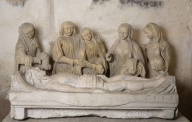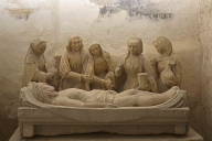 Commentaire historique : Dans ce groupe sculpté de la mise au tombeau, seuls le gisant du Christ et le tombeau en calcaire datent du dernier quart du 15e siècle, les autres personnages sont des moulages en plâtre exécutés à la limite des 19e siècle et 20e siècles. Datation(s) principale(s) : 4e quart 15e siècle ; limite 19e siècle 20e siècle