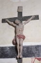 Commentaire descriptif : Statue en pied, portant des traces de polychromie (peinture rouge pour le périzonium, noire pour les cheveux et la barbe, rose pour la carnation). Catégorie(s) technique(s) : sculpture Matériau(x) et technique(s) : bois : peint (polychrome) Représentation : Christ en croix Dimensions : h = 264 ; l = 150 ; Christ : 150 h ; 100 l Etat de l'oeuvre : mauvais état Précisions sur l'état de l'oeuvre : Vermoulures. Fortement empoussiéré.
