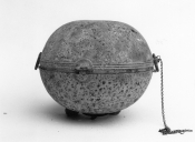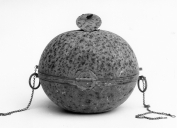 Commentaire descriptif : Le reliquaire est composé de deux demi-sphères. La demi-sphère inférieure est percée à sa base d'une petite cavité circulaire, pouvant être obstruée par une pièce métallique circulaire portant un embout central. Quatre attaches latérales fixées à l'aplomb les unes des autres se trouvent sur les deux demi-sphères. Les attaches de la demi-sphère supérieure comportent chacune un anneau. Deux chaînettes sont fixées respectivement à l'attache droite de la demi-sphère supérieure et à l'attache gauche de la demi-sphère inférieure. Les deux demi-sphères sont fixées entre elles par une charnière et fermées par une goupille. La plaque mobile de la demi-sphère inférieure est fixée par une charnière. Les quatre attaches sont soudées. Catégorie(s) technique(s) : orfèvrerie Matériau(x) et technique(s) : fer : repoussé Précisions sur la représentation : Deux moulures soulignent le pourtour de la demi-sphère inférieure. Dimensions : h = 15 ; d = 19 ; plaque : 4 d Etat de l'oeuvre : mauvais état Précisions sur l'état de l'oeuvre : Métal oxydé.