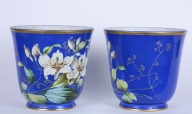 Catégorie(s) technique(s) : céramique Matériau(x) et technique(s) : porcelaine dure : glacé, peint, doré Précisions sur la représentation : Sur fond bleu roi, décor floral peint (tons blancs, jaunes et verts). Dimensions : h = 21 ; d = 22 ; pied : 13 d Marques, inscriptions, emblématique, poinçons : marque d'atelier