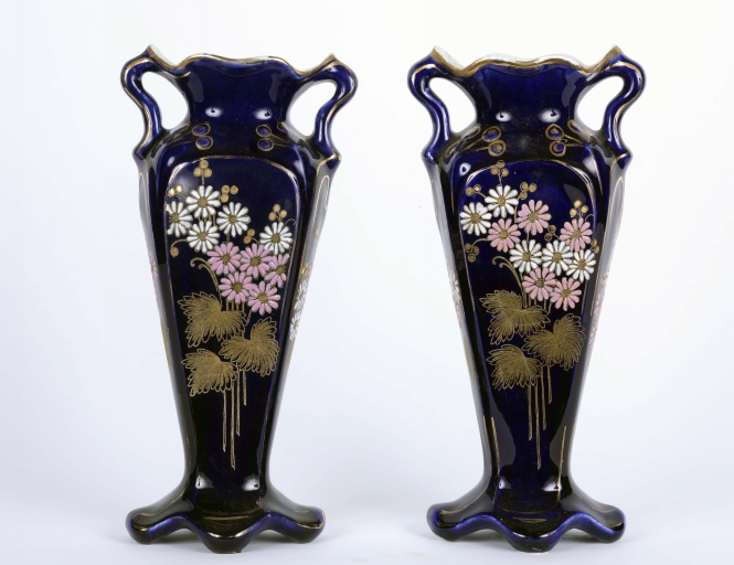 Saint-Gence, Présentation des objets mobiliers de l'église paroissiale Saint-Gentien | Série de deux vases à pied chantourné et décor de fleurs sur fond bleu marine. Atelier limougeaud. Fin 19e siècle. Porcelaine dure. En place sur le maître-autel. |