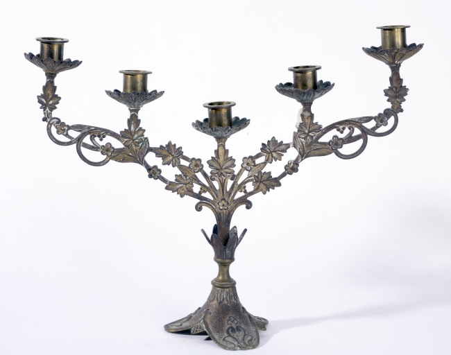Saint-Gence, Présentation des objets mobiliers de l'église paroissiale Saint-Gentien | Chandelier de style girandole à deux branches et base tripède. 19e siècle. Cuivre. Conservé dans le placard de la sacristie. |