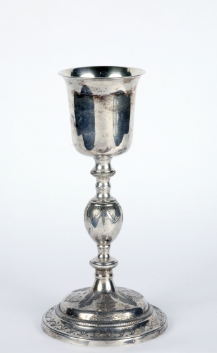 Saint-Gence, Présentation des objets mobiliers de l'église paroissiale Saint-Gentien | Calice. Poinçon de maître de l'orfèvre BASNIER, dans un losange, sous le pied. 1ère moitié 19e siècle. Argent ciselé et gravé ; vermeil. Conservé dans l'armoire de la sacristie. |