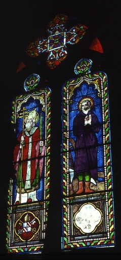 Saint-Gence, Verrière (3) (verrière à personnages, verrière décorative) : saint Damas et saint Gentien, Vierge de l' Assomption, saint Joseph | Vitrail 1 : vue générale. |